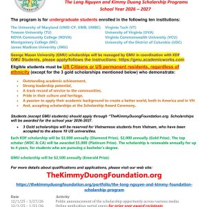 Qualifications – Southern California To qualify for The Long Nguyen and Kimmy Duong Undergraduate Scholarship Program in Southern California, […]